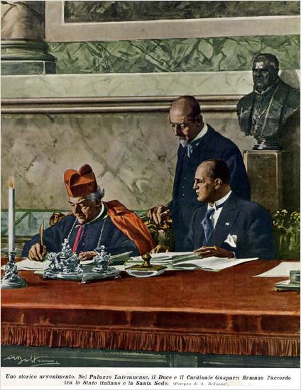 (*) Les Pactes du Latran sont les accords signés le 11 février 1929 par l'Italie, représentée par Benito Mussolini (alors président du Conseil) et l'Eglise, mettant fin à la "question romaine" et réduisant la souveraineté temporelle du pape au seul État de la Cité du Vatican.