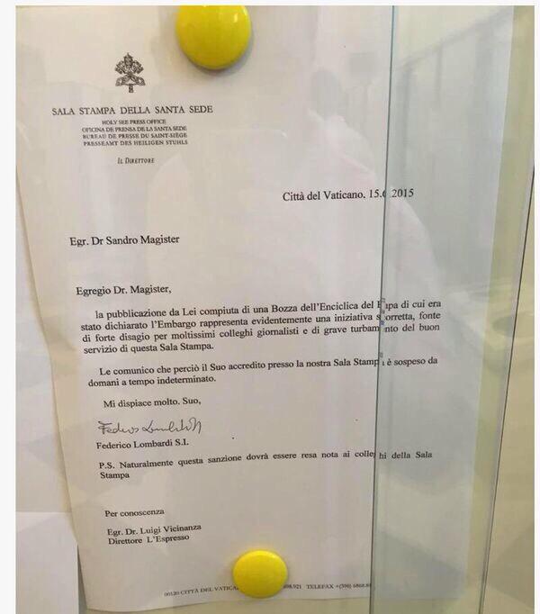 La divulgation par vos soins d’un projet du texte de l’encyclique pontificale, pour lequel un embargo avait été déclaré, est une initiative manifestement incorrecte. Elle est source d’un profond malaise pour de très nombreux collègues journalistes et affecte sérieusement le bon fonctionnement de ce service de presse.