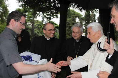 Pour tout dire je pense qu’il serait bien pour les memores et Mgr Gänswein de changer un peu d’air avec lui. Il y a deux ans qu’ils vivent à Mater Ecclesiae et peut-être serait-il bon d’apporter quelques modifications au bâtiment, pratique avant tout. Notre pape émérite reçoit des visites et sort dans les Jardins du Vatican, il est entouré, son secrétaire avec parapluie noir en main et sourire éclatant l’abrite sous les ombrages, cadeaux, un geste de la main de Benoît XVI depuis la voiture électrique pour dire au revoir avant de rentrer à la maison; rien que de la joie avec les visiteurs comblés (cf. Rencontre avec les séminaristes de Faenza) .