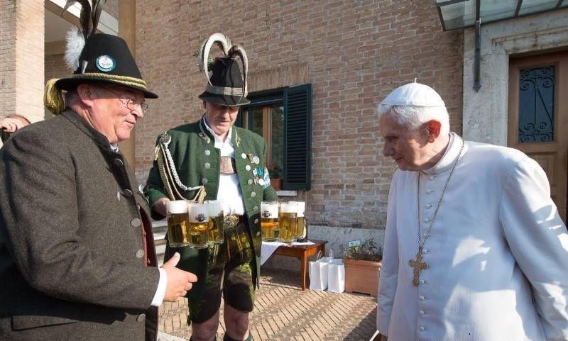 L’ambiance était festive à Mater Ecclesiae avec les Bavarois en costumes si colorés et une météo favorable (cf. Benoît XVI fête son anniversaire). Benoît devait apprécier cette présence de son pays, de sa chère Bavière. En plus de la partie folklorique certaines spécialités gastronomiques avaient dû suivre pour compléter ce rendez-vous bavarois. Parmi les nombreuses photos il y a celle du pape émérite, bras grands ouverts, face à tous ses visiteurs, il est en très bonne forme, teint frais, reposé, détendu. Sur ces clichés on voit Mgr Gänswein bien sûr, très souriant, les Memores Domini, Sœur Christine, Mgr Georg Ratzinger, les sacs contenant les provisions apportées à côté d’une table avec de quoi se désaltérer, une fête de famille dans la joie et la simplicité de bon goût. Il y a une photo qui me fait rire : on y voit Benoît l’air dubitatif, hésitant devant les chopes de bière qui lui sont présentées