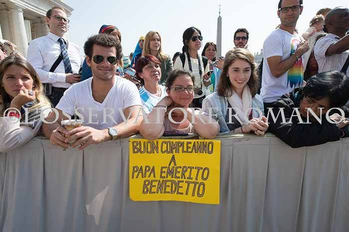 Il n’hésite pas à dire que Benoît est de plus en plus aimé et j’apprécie cette franchise. Je rattache à ses paroles la présence d’une banderole fixée aux barrières de séparation lors de l’Audience générale : « Buon compleanno a Papa emerito Benedetto ». Je garde en mémoire les