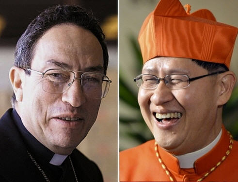 >>> Ci-contre: les cardinaux Maradiaga et Tagle, le président sortant, et le nouvel élu.