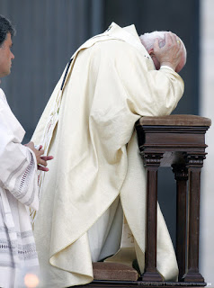 Il est notoire que JMB/PF ne peut pas se mettre à genoux ou faire de génuflexion en raison d'un problème d'arthrite ou de sciatique qui lui cause une douleur intense, ce qui est censé expliquer pourquoi il ne fait pas de génuflexion, même pendant la Consécration (bien qu'il ait été photographié à genoux devant l'icône mariale à Santa Maria Maggiore, le lendemain de son élection, et, bien sûr, avec Benoît XVI à Castel Gandolfo, et plus tard à Mater Ecclesiae. La première fois, il s'agissait évidemment d'une opprtunité historique et donc un 'must', et avec B16, de quoi cela aurait-il eu l'air s'il ne s'était pas mis à genoux tandis qu'un homme de 10 ans plus âgé le faisait)?
