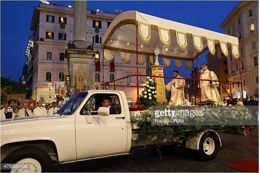 Dans sa première année de pontificat, il avait étonné le monde avec l'une de ses exclusivité «Regardez comme je suis différent de tous les autres papes» en marchant derrière l'Eucharistie (monté comme d'habitude sur un char spécial pour être visible de tous ceux qui suivent la procession le long de Via Merulana). Jean-Paul II et Benoît XVI accompagnaient l'Eucharistie au cours de ces processions sur le char, à genoux sur un prie-Dieu devant le Saint-Sacrement.