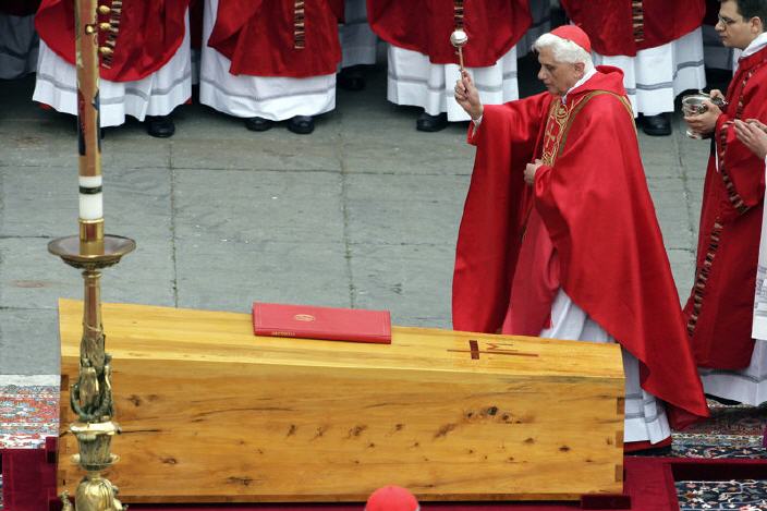 «Suis-moi», dit le Seigneur ressuscité à Pierre; telle est sa dernière parole à ce disciple, choisi pour paître ses brebis. «Suis-moi» – cette parole lapidaire du Christ peut être considérée comme la clé pour comprendre le message qui vient de la vie de notre regretté et bien-aimé Pape Jean-Paul II, dont nous déposons aujourd’hui le corps dans la terre comme semence d’immortalité - avec le cœur rempli de tristesse, mais aussi de joyeuse espérance et de profonde gratitude.