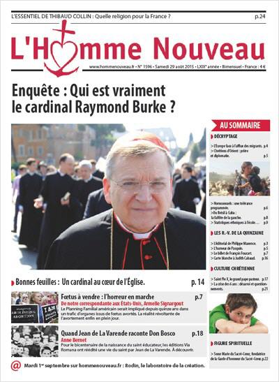 Le numéro de septembre de L'Homme Nouveau, avec un dossier sur le cardinal Burke. Et l'annonce d'un livre d'entretiens du cardinal américain avec Guillaume d'Alançon (*), à paraître ces jours-ci aux éditons Artège