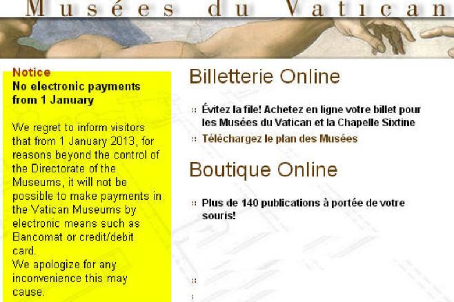 Le 1er janvier 2013, tous les paiements par carte bancaire étaient suspendus au Vatican (voir ici: tinyurl.com/oh8khed)