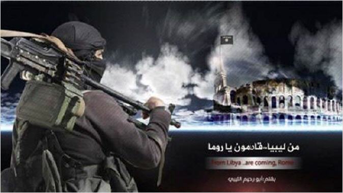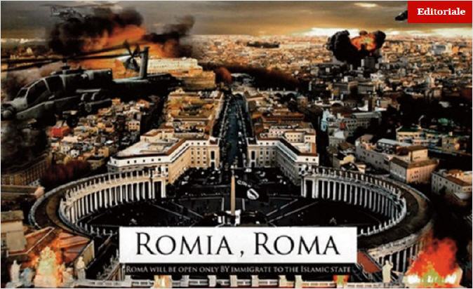 «La Libye est la porte pour arriver jusqu'à Rome». C'est le titre de la nouvelle campagne de terreur de l'Isis en Libye, qui sur Twitter a publié une série d'images montrant la ville éternelle en flammes, surmontée d'une carte de la Libye, où flotte le drapeau noir du Califat. Dans un message posté sur son compte Twitter un combattant de l'Isis, Abou el Gandal Barkawi, lance aux djihadistes un appel à «aller à Rome, ou Romía, en passant par la Libye, la porte vers Rome». Dans le texte Barkawi ajoute: «Les armes des Ottomans ont été lancées et ont encerclé Rome après avoir conquis la Libye au sud de l'Italie» (Ansa.it, 25/8/2015).
