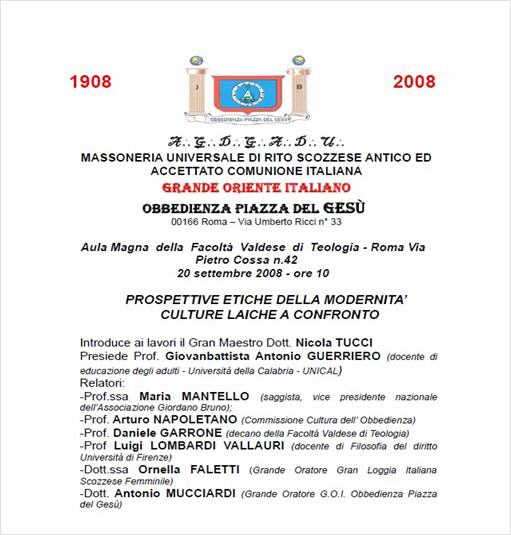 Les relations entre Vaudois et francs-maçons sont à ce point étroites qu’en 2008, à l’occasion du centenaire de sa fondation, le Grand Orient organisa une conférence à l’université vaudoise de Rome ; cette conférence comptait, au nombre de ses orateurs, le doyen de la faculté vaudoise de théologie. Notons au passage que cette rencontre eut lieu symboliquement un 20 septembre, jour de la prise des Etats pontificaux.