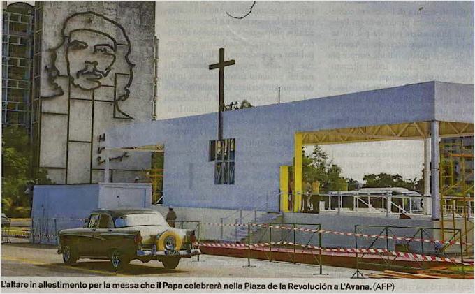 La scène qui, le 28 Mars 2012, accueillit la messe de Ratzinger devant trois cent mille Cubains avait été dressée du côté diamétralement opposé de la place, à des centaines de mètres de Che Guevara, à qui les fidèles tournaient le dos. Très loin, lui aussi, du révolutionnaire à la gâchette facile, Jean-Paul II le 25 Janvier 1998: à côté de lui, au lieu du "Che" et du «Hasta la victoria siempre», se dressait une immense toile peinte représentant le Christ avec les mots «En ti confido», placée là pour couvrir la façade de la Bibliothèque nationale (...)