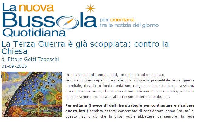 Ces derniers temps, tous, monde catholique inclus, semblent soucieux d'éviter une Troisième Guerre mondiale (ndt: évoquée à plusieurs reprises par François, notamment en juin dernier à Sarajevo) supposée prévisible, dûe aux fondamentalismes religieux, au nationalisme, au racisme, aux discriminations variées, qui se sont dramatiquement accentués grâce à l'accélération de la mondialisation, au terrorisme international, etc. .
