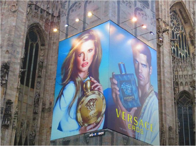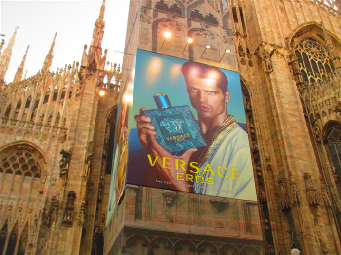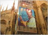 Au centre, le Duomo est orné d'une pub satanique, d'esprit Illuminati, le parfum Eros de la dynastie Versace. Il y a aussi Samsung. Cela n'empêche pas les autorités ecclésiastiques locales de réclamer treize euros pour monter voir les flèches. Toute la place est envahie de riches pakistanais, yankees et chinois qui cherchent ici à acheter pour cinq mille euros ce qu'on achète pour trois mille ailleurs. Dès qu'on sort de la place, on est dans le désert.