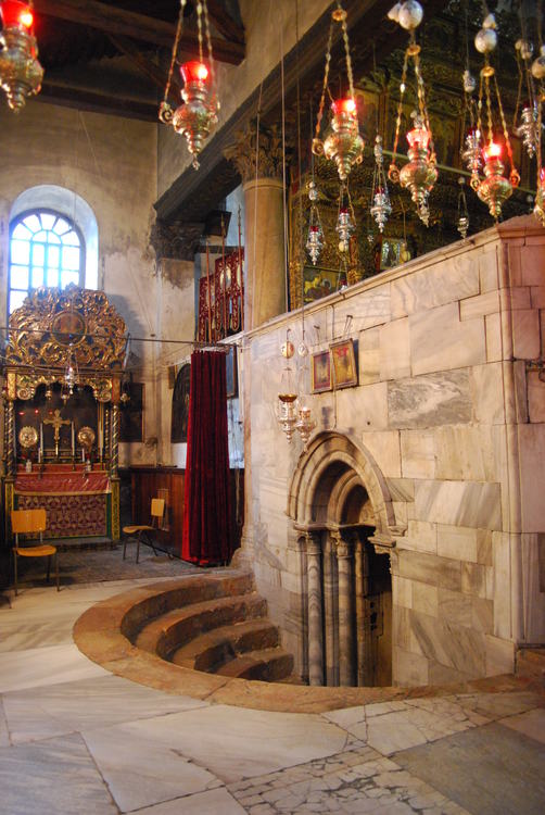 La grotte où le Christ est né est en-dessous du maître-autel. On y accéde par une courte volée de marches que nous eûmes quelques difficultés à franchir lorsque plusieurs prêtres grecs survinrent dans un nuage d'encens tourbillonnant. Cinquante-trois lampes d'argent dissipent à peine la pénombre de cette grotte à la voûte basse, noircie par la fumée. J'ai vu l'étoile de bronze encastrée dans une niche au sol, avec tout autour l'inscription en latin: "Ici est né Jésus Christ de la Vierge Marie."