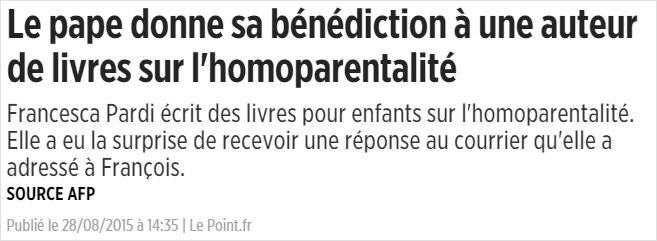 Le pape François a envoyé sa bénédiction à Francesca Pardi, auteur et éditrice de livres pour enfants sur l'homoparentalité en Italie, qui lui avait fait parvenir ses livres décriés par une partie des catholiques. Le Vatican a cependant pris soin de préciser qu'il s'agissait d'une correspondance privée qui ne remettait pas en cause la doctrine de l'Église condamnant la "théorie du genre".