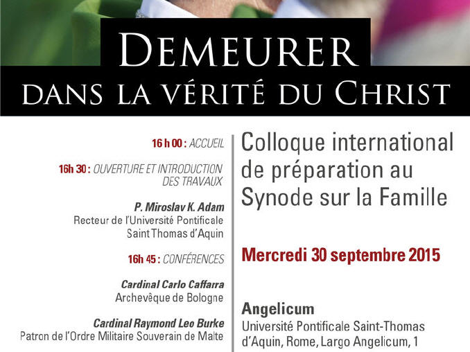 Les conférenciers (le cardinal Carlo Caffarra, le cardinal Raymond Leo Burke, Mgr Cyril Vasil’, le professeur Stephan Kampowski) demanderont une réaffirmation claire et intégrale de la tradition catholique sur les problèmes de la vie, de la famille et de l’éducation. Le colloque organisé par La Nuova Bussola Quotidiana, Il Timone, L’Homme nouveau, Dignitatis Humanæ Institute, Infovaticana, se terminera par la présentation de l’Appel au Synode (texte joint).