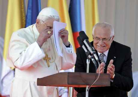 Pour situer l'homme dans la perspective qui est celle de mon site, qu'il suffise de dire que dans la République tchèque rescapée du communisme et massivement athée, lors de son voyage du 26 au 28 septembre 2009 (cf. benoit-et-moi.fr/2009), Benoît XVI avait reçu un accueil exceptionnellement chaleureux: le Président Klaus l'avait accompagné à chacune des étapes, mis à sa disposition, geste de courtoisie vraiment extraordinaire, son propre avion présidentiel, pour son déplacement à l'intérieur du pays, mais aussi pour le voyage de retour vers l'Italie. Et au moment du départ, il lui avait adressé un discours en italien (autre marque insigne de courtoisie, et exercice nullement évident si l'on considère l'écart entre les langues slaves et les langues latines), mémorable. On lira en annexe ma traduction en français, d'après le texte publié à l'époque sur Radio Vaticana.