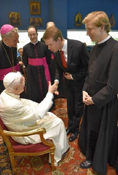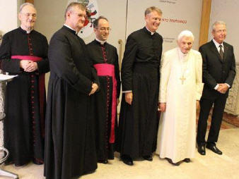 En haut à gauche, Benoît XVI s'entretient avec Mgr Tomas Halik, le prêtre tchèque, qui était le rapporteur de la rencontre de cette année (voir ici une interview par Andrea Gagliarducci)