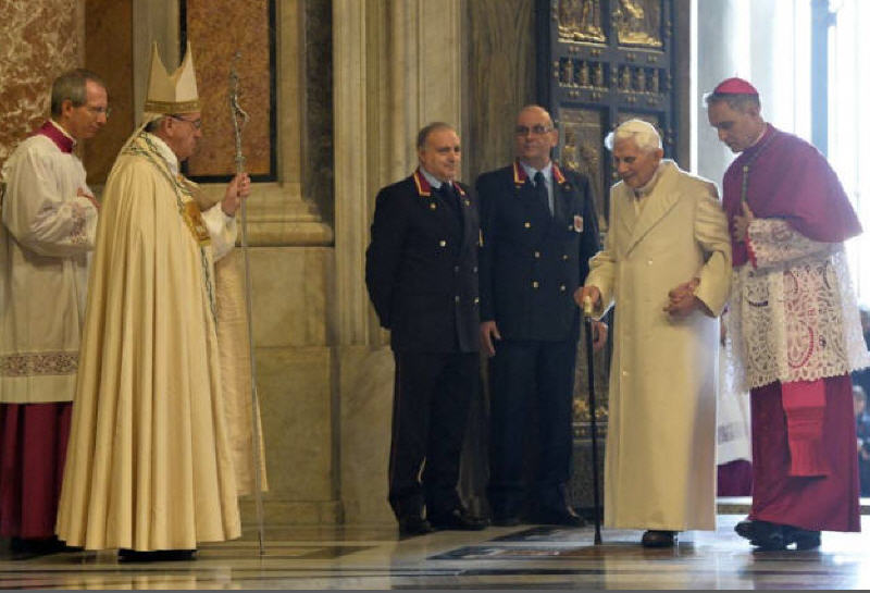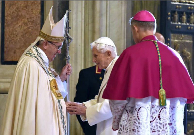 Le salut de François à Benoît XVI avant l'ouverture de la "Porte de la Miséricorde", dans l'atrium de la Basilique