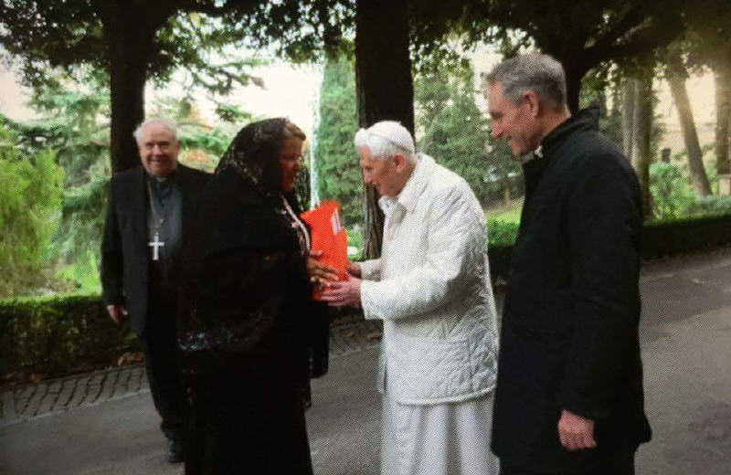 Après qu'il nous ait remis son cadeau, nous nous sommes agenouillés pour recevoir sa bénédiction; un salut individuel à chacun avant de monter dans le petit véhicule qui le ramènerait au monastère "Mater Ecclesiae", d'où il nous a encore une adressé un salut avec sa main et un sourire rempli de joie et de sérénité.