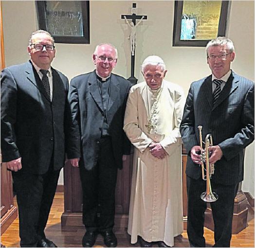 Légende de la photo : les hôtes d’Amberg avec le pape émérite (de gauche à droite) : le chantre B. Müllers, le curé F. Meiler, Benoît XVI, le trompettiste F. Badura. Image : hfz.