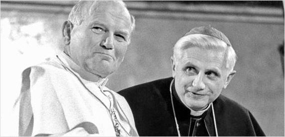 Sur une photo de Benoît XVI, publiée sur différents sites pour illustrer l'hommage de Benoît XVI à son prédécesseur, on voit le Pape avec un sourire énigmatique et, à sa gauche, un peu en retrait, un jeune cardinal, son préfet de la CDF, sourire aux lèvres, visage enfantin, cheveux déjà blancs, qui écoute les paroles du maître. J’aime cette image. Il est certain que les deux hommes formaient une équipe de travail hors norme. Ce n’était pas de l’amitié au sens courant du terme, cette relation qui s’établit le plus souvent sur des confidences, des vécus communs depuis fort longtemps. Ce genre de rapport devait être réservé par Jean-Paul II à ses proches polonais et à ceux qui partageaient sa vie personnelle. Par contre, avec son Préfet, s’était créée une syntonie réelle basée sur une foi inébranlable, une profonde estime, un même amour de l’Eglise, la confiance totale que le Pape vouait au cardinal. Ce Saint-Père globe-trotter parcourait le monde entier et avec quel panache!, mais à la maison il y avait celui qui veillait et recevait les coups avec abnégation pour défendre la pureté de la foi. Sur la fin de sa vie Jean-Paul II, déjà très malade, qualifiait le cardinal de ces mots : «un véritable ami» tout en tenant longuement sa main dans les siennes; des photos en attestent.