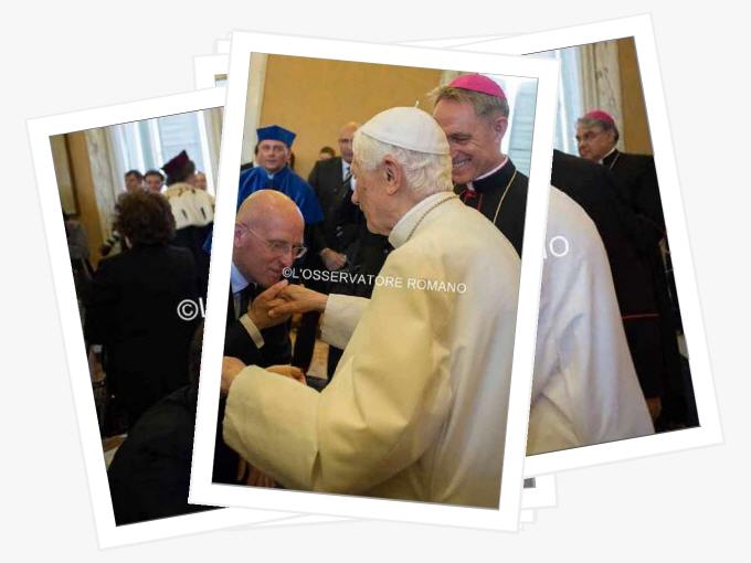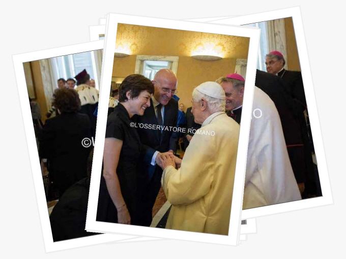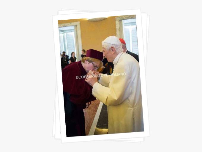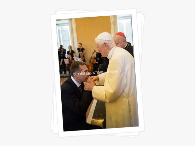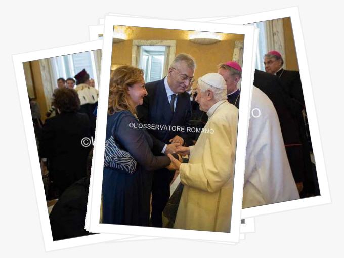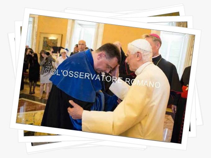 Passé et présent de Benoît XVI se mêlent pour constituer la trame de cette vie si riche. Sur les photos il n’a pas caché sa joie, visage heureux, mains serrées avec chaleur, accueil spontané et reconnaissant des titres remis, des universitaires et autres à la fin de la cérémonie, pas un mot pour se mettre en valeur, un orateur détendu maîtrisant parfaitement son sujet et charmant ainsi l’assemblée de grande classe et hautement intellectuelle amis sans rien de surfait, l’apanage des sujets brillants. La musique ne pouvait qu’être que présente. Cette musique qu’il apprécie tant et dont il parle avec brio fait partie intégrante de sa vie depuis sa tendre enfance. Au cours de ses nombreux déménagements son piano en dépit de certains problèmes de manutention l’ont toujours suivit, fidèle compagnon de toute une vie car il ne faut pas oublier qu’il est un pianiste averti.