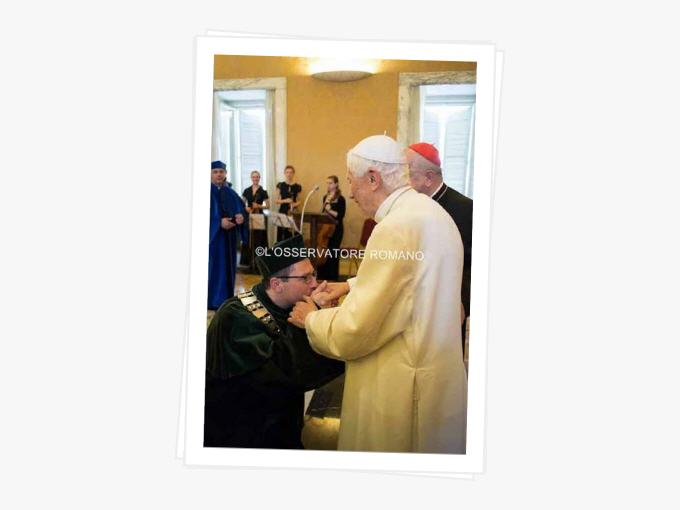 Puis c’est l’arrivée du récipiendaire sans canne, les paroles d’accueil, les mains serrées, l'émotion du cardinal Dziwisz, très visible, des clichés pris avant le discours, on lui remet les diplômes et le visage du pape émérite est radieux.