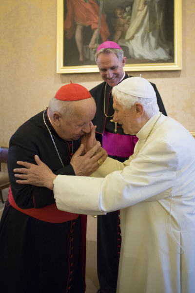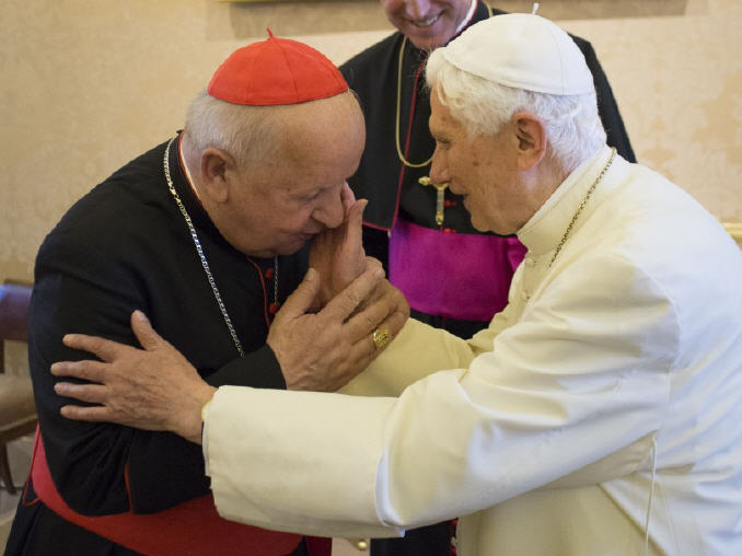Une affection mutuelle, scellée par une étreinte entre le Pape émérite et le cardinal Dziwisz et rendue évidente par le choix de Benoît XVI d'accepter les doctorats.
