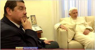 Alan Holdren (à gauche ci-dessus) correspondant à Rome de l'agence de nouvelles Catholic News Agency (CNA) et de la chaîne de télévision catholique américaine EWTN, et Alejandro Bermudez, directeur du portail catholique multilingue ACI Prensa, basé au Pérou, ont été reçus par Benoît XVI à Mater Ecclesiae le 8 octobre