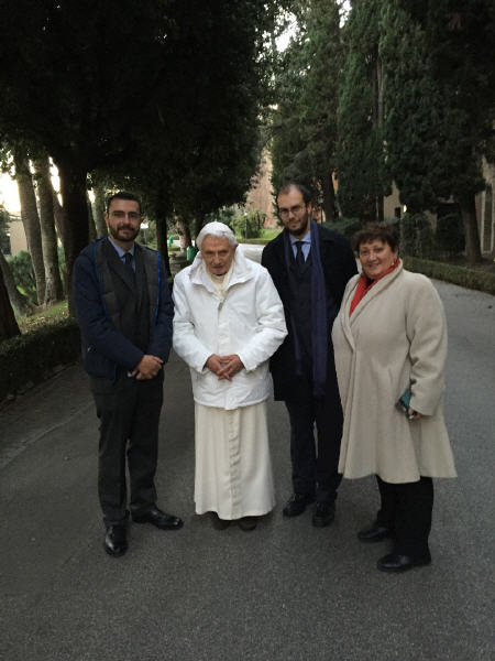 1ère photo en haut à gauche. De gauche à droite, entourant Bnoît XVI: Marco Mancini, Andrea Gagliarducci et Angela Ambrogetti