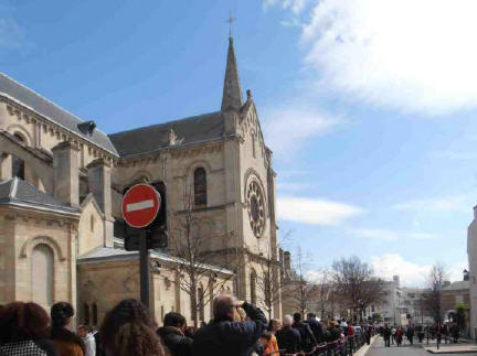 La messe de 11 heures présidée par Mgr Lalanne, évêque du diocèse, est finie, et la visite à la Sainte Tunique a repris de plus belle. Des jeunes volontaires chargés de l’accueil, dirigent vers un accès plus aisé que les marches du parvis, les personnes en chaises roulantes. Dans la queue, venus en famille par forcément directement de leurs régions ou pays d’origine mais installés en région parisienne ou y séjournant depuis un certain temps, des catholiques originaires des Antilles ou de l’Afrique Noire, de nombreux chrétiens orientaux, des asiatiques aux racines sans doute liées à l’Ancienne Indochine française, mais aussi arrivés plus récemment de Chine, de nombreux femmes en sari, en provenance des territoires évangélisés au XVème siècle, grâce aux routes maritimes ouvertes par les Portugais, et à François Xavier, et notamment des anciens territoires portugais des Indes et surtout de Ceylan (Sri Lanka), quelques gitans d’Europe occidentale et des tsiganes d’Europe centrale. J’entends aussi des Européens de langue slave, je ne peux dire s’il s’agit de catholiques latins et/ou gréco-catholiques, voire d’orthodoxes qui ont pu dire la semaine passée les vêpres face à la Tunique. Et bien sûr des catholiques français d’origine plus européennes qui au fur et à mesure que l’après-midi avance vont se faire toujours plus nombreux et qui sont sans doute en provenance d’autres diocèses que celui de Pontoise. Des scouts et des jeannettes ont une petite tente et proposent des crêpes et des boissons. Mais nous ne voulons pas perdre notre place dans la file et nous résistons à la tentation, la Tunique mérite bien ce petit jeûne et nous n’avions qu’à prévoir le sac à dos et le casse-croute!