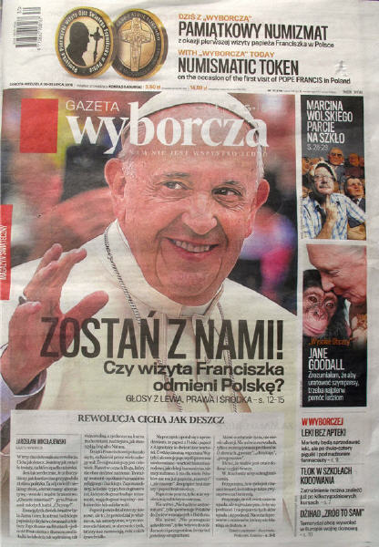 Voici la une de l’édition du 30 et 31 juillet 2016 (week-end de la fin des JMJ) du quotidien de la gauche libérale libertaire Gazeta Wyborcza et second quotidien de Pologne en terme de diffusion (tirage moyen en 2016: 230 000 exemplaire; exemplaires vendu en moyenne 140 000)