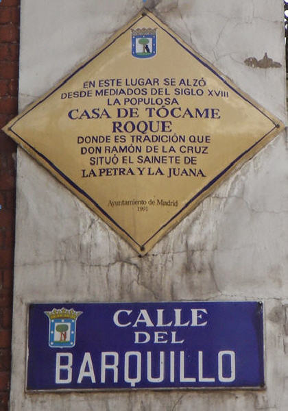 Plaque de l’actuelle rue du « Barquillo » à Madrid, qui précise qu’en ce lieu se dressait à partir de la moitié du XVIIIe siècle la Maison de Tócame Roque où la tradition dit que Ramón de la Cruz (1731-1794) situa sa pièce « La Petra y la Juana ».