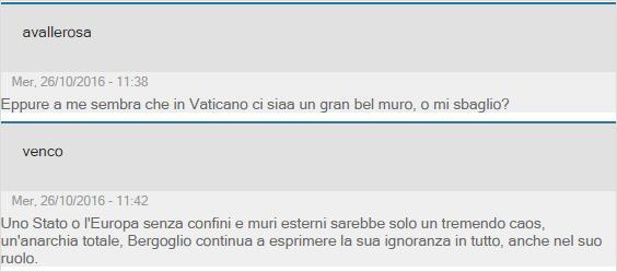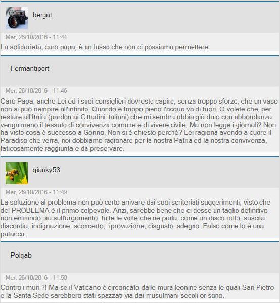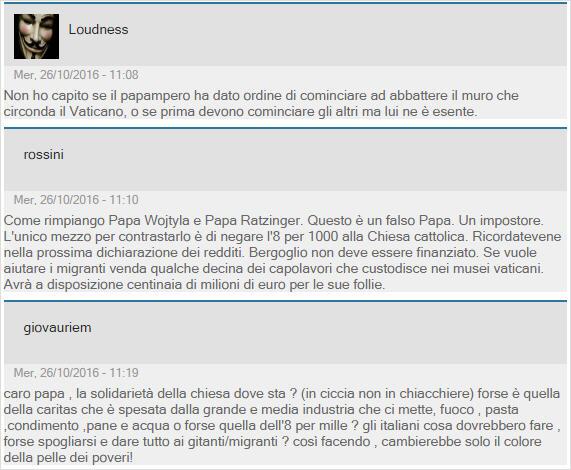 Le plus intéressant, ce sont les commentaires des internautes, et ils sont dans l'ensemble féroces. Le ton général est à l'exaspération, beaucoup se moquant des murs qui entourent le Vatican, certains allant même jusqu'à refuser de "financer Bergoglio" en suggérant de cesser de payer l'impôt à l'Eglise (le fameux "huit pour mille")