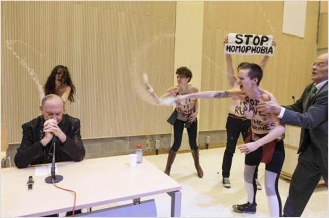 Ci-dessous: Une image terrible de Mgr Leonard agressé par les femen en avril 2013 (d'autres ici: www.lacapitale.be)