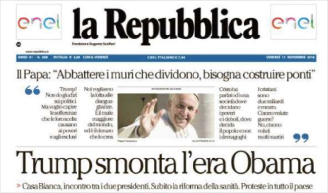 L'éditorial hebdomadaire du dinosaure du journalisme d'extrême-gauche et fondateur de la Repubblica fait état d'un nouvel entretien avec François. Et il fait grincer les dents de pas mal de gens, notamment de Riccardo Cascioli (14/11/2016)