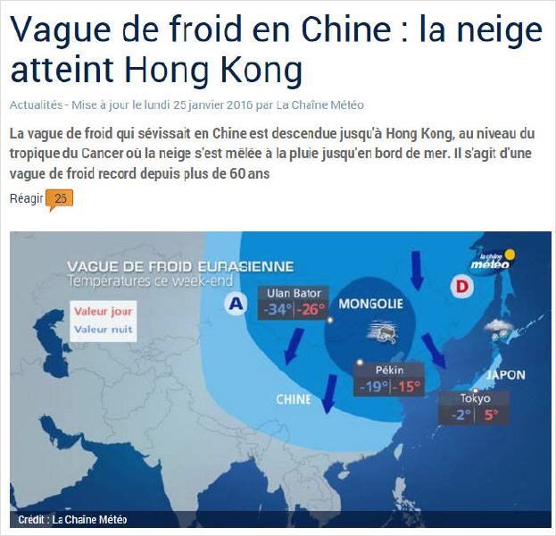 Simultanément, un autre évènement climatique inhabituel frappe en ce moment la Chine, suscitant toutefois beaucoup moins d'intérêt de la part des médias. Serait-ce que le sort des Chinois les laissent nettement plus indifférents que celui de leurs "amis" américains? Passons.