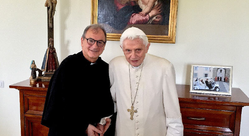 A l'occasion de la bénédiction pascale de l'appartement du Pape émérite Benoît XVI, Mgr Georg Gänswein m'a proposé de m'entretenir à table davec le pape Benoît, suscitant dans mon cœur une grande émotion. Le rendez-vous est pour le mardi 12 Avril à 13h15, quand Mgr Georg quitte habituellement son bureau de préfet de la Maison pontificale. Nous nous sommes rencontrés au portail d'entrée et quelques minutes après, nous avons rejoint le Saint-Père dans son bureau au premier étage, où il y avait aussi quatre memores qui s'occupent de la maison. Le Saint-Père m'a accueilli avec une bonté paternelle et j'ai eu le courage d'adresser aux présents quelques mots de circonstance, avant la distribution et la lecture de la prière de la bénédiction de Pâques. A la fin, le Saint-Père a exprimé sa gratitude pour mes paroles et nous sommes entrés dans la salle à manger, commençant le repas seulement après la prière prononcée par le Saint-Père. Il voulait en apprendre davantage sur les activités paroissiales qui se déroulent, faisant l'éloge de l'engagement apostolique quotidien. Il a également demandé des nouvelles de l'activité particulière des religieux: du Père Stefano Canute à la Congrégation pour les Religieux et du Père Jafet Ramón Ortega en tant que directeur de la Cappella Giulia.