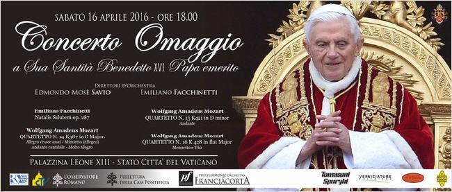 Les quatuors que Wolfang Amedeus Mozart a dédiés à Haydn seront au programme du concert que l'Orchestre Philharmonique du Franciacorta (région du nord de l'Italie aux environs de Brescia) donnera le 16 Avril prochain à 18 heures à la "Sala Assunta" de la Palazzina Léon XIII au Vatican, en présence de Sa Sainteté le pape Benoît XVI (et de son frère aîné Mgr Georg Ratzinger, qui a eu 92 ans le 15 janvier dernier) pour ses 89 ans; et plus particulièrement le K387 (n. 14) en sol majeur, et une sélection du K421 (n. 15) en ré mineur et du k428 (16) en mi bémol majeur.
