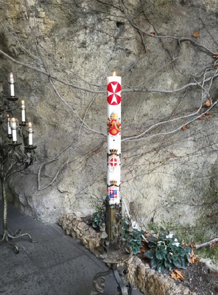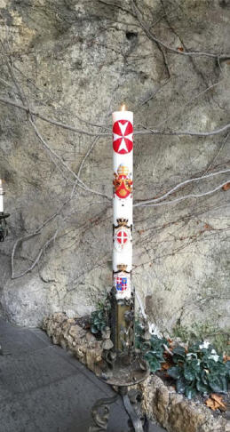 A noter, le cierge devant la grotte de Lourdes, avec les armoiries du Pape Benoît (cf. benoit-et-moi.fr/2015-II/benot-xvi/le-cierge-pascal-de-mater-ecclesiae).