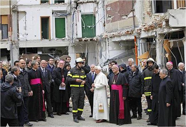 Le tragique évènement du tremblement de terre invite la Communauté civile et l'Église à une profonde réflexion. Comme chrétiens nous devons nous demander : « Que veut nous dire le Seigneur à travers ce triste évènement ? ». Nous avons vécu la Pâque en affrontant ce traumatisme, en interrogeant la Parole de Dieu et en recevant la crucifixion et la résurrection du Seigneur comme une nouvelle lumière. Nous avons célébré la mort et la résurrection du Christ, portant dans l'esprit et dans le coeur votre douleur, priant pour que ne s'évanouissent pas chez les personnes frappées la confiance en Dieu et l'espérance. Mais même comme Communauté civile, il faut faire un sérieux examen de conscience, pour que le niveau des responsabilités, à tout instant, ne soit pas occulté. À cette condition, l'Aquila, même blessée, pourra reprendre son vol.