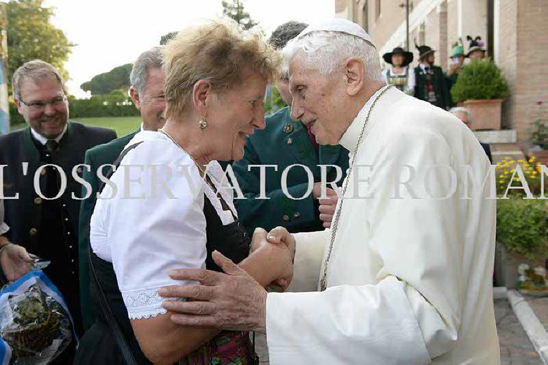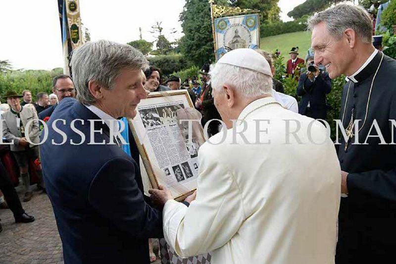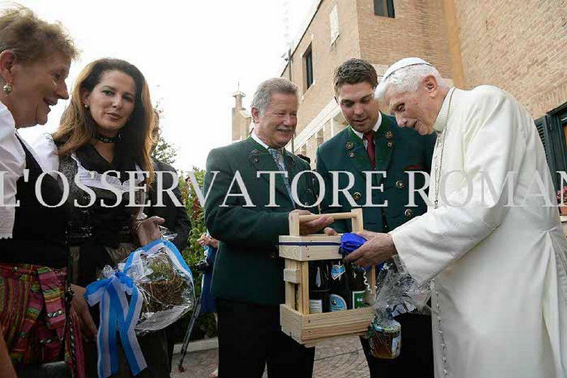 Durant la soirée le pape Benoît se tenait au centre, visiblement heureux d’avoir ces petites conversations, de recevoir ces nombreux cadeaux, venant du pays. Des livres offerts par Mr le curé Georg Lindl sur la petite église d’Ettendorf et les environs. De la bière de la région offerte par le conseiller du Land Siegfried Walch et ses adjoints Resi Schmidhuber, Sepp Konhäuser et Andreas Danzeu. Des spécialités du pays de Berchtesgaden apportée par la députée Michaela Kaniber.