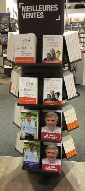 Sans compter que de nombreux ouvrages étrangers consacrés à personnalité et à son pontificat, en Italie ou en Allemagne, ou aux Etats-Unis, (par exemple l'importante biographie de Peter Seewald, publiée en 2007 sous le titre "Benedikt XVI, Ein Porträt aus der Nähe", ou le livre de Roberto Regoli publié récemment en Italie et dont nous avons beaucoup parlé dans ces pages "Oltre la crisi della Chiesa: il Pontificato di Benedetto XVI") n'ont pas été traduits dans notre langue, alors que le moindre livre à scandale sur l'Eglise (par exemple les ouvrages de Gianluigi Nuzzi, ou Carmelo Abbate)... et les innombrables opuscules - "biographies" et recueils de "pensées" - consacrés à son successeur, s'étalent en tête de gondoles de toutes les "librairies" - on peut douter que l'intérêt du public le justifie.