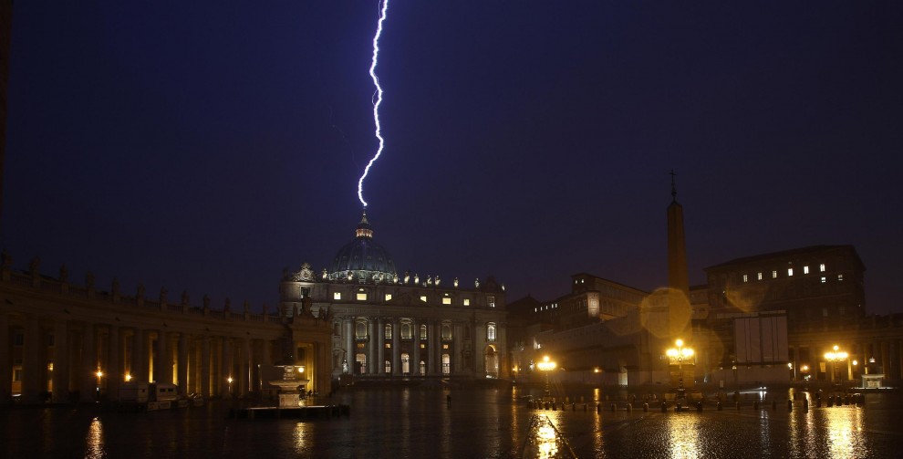 - Je ne sais pas si vous avez vu vous aussi une photo prise par un correspondant de la BBC qui, le jour de votre démission, montrant le dôme de Saint-Pierre frappé par la foudre (Benoît fait un signe de la tête pour dire qu'il l'a vue). A beaucoup, cette image a suggéré l'idée de la décadence ou même de la fin d'un monde. Aujourd'hui, cependant, j'ai envie de dire: ils s'apprêtaient à pleurer un vaincu, une défaite de l'histoire, mais je vois ici un homme serein et confiant.
