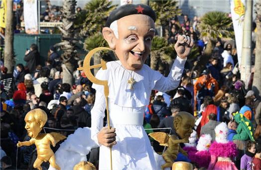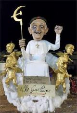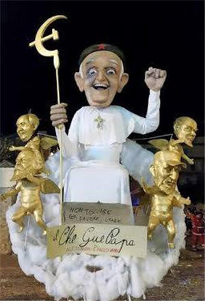 Au Carnaval de Viareggio, il ne semble pas qu'il y ait de catholiques «conservateurs». Mais ils ont représenté le pape Bergoglio avec la faucille et le marteau, poing fermé et portant le béret du Che. En dessous, l'inscription: Che GuePapa. Et autour, des angelots avec les visages de Marx, Lénine, Fidel Castro et Mao. Que diront-ils au Vatican? Ils vont crier au complot? Ce sera la faute de Burke? Ou de Trump?