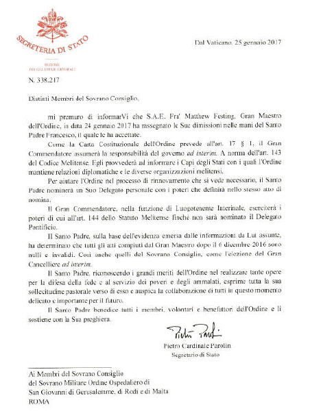 Ecrivant au nom du pape aux membres du conseil de gouvernement de l'Ordre le 25 janvier, le Secrétaire d'Etat du Vatican le cardinal Pietro Parolin a déclaré que «le Saint-Père, sur la base des preuves découlant des informations qu’il a recueillies, a déterminé que toutes les mesures prises par le Grand Maître après le 6 décembre 2016 sont nulles et non avenues».