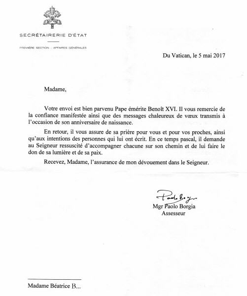 Voici la réponse que j'ai reçue... sous une simple enveloppe banalisée portant le cachet d'un bureau de poste du XVe arrondissement parisien (21/5/2017)