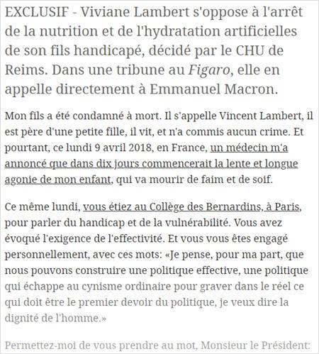 Après la condamnation à mort d'Alfie, en Angleterre, voici celle de Vincent Lambert en France. Je relaie bien volontiers l'appel à diffuser la lettre bouleversante de sa mère au Président de la république (12/4/2018)