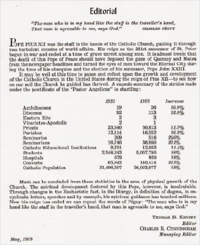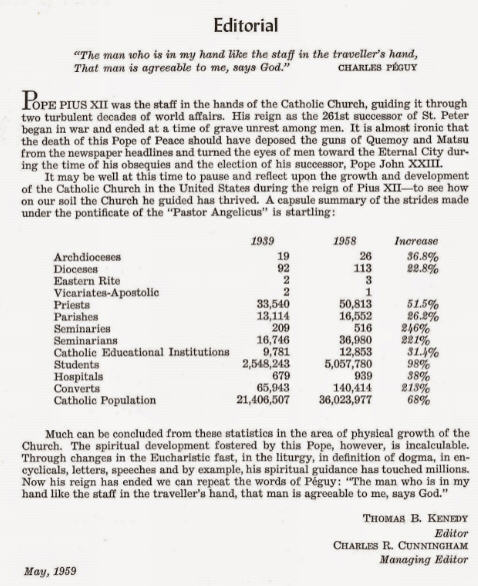 A l'intention de ceux qui disent que nous vivons aujourd'hui l'âge le plus grand de l'Église, considérons les chiffres ci-dessous, rien que pour les diocèses des États-Unis sous le règne de Pie XII. Ils sont pour le moins remarquables, et si la canonisation d'un Pape prend aussi en considération l'appréciation de son pontificat (en plus de sa sainteté personnelle et sa sagesse prophétique, toutes deux irréprochables chez le Pape Pacelli), alors ils méritent certainement une observation: