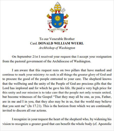 Le 21 septembre, j'ai reçu votre requête d'accepter votre démission du gouvernement pastoral de l'archidiocèse de Washington.